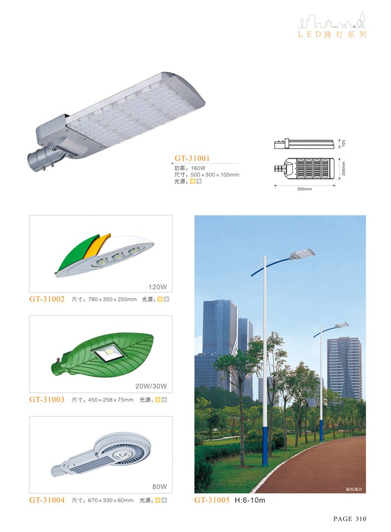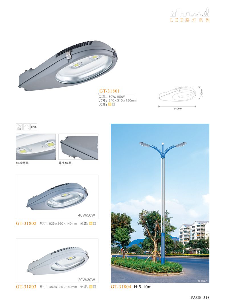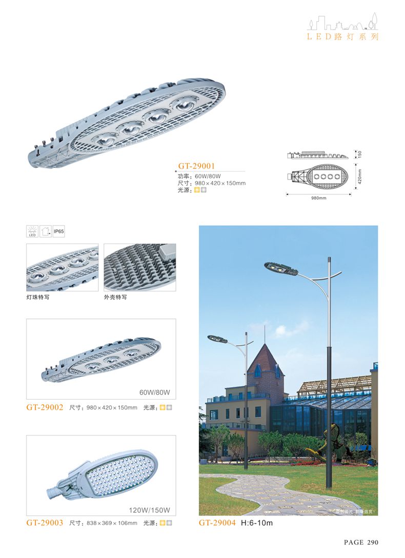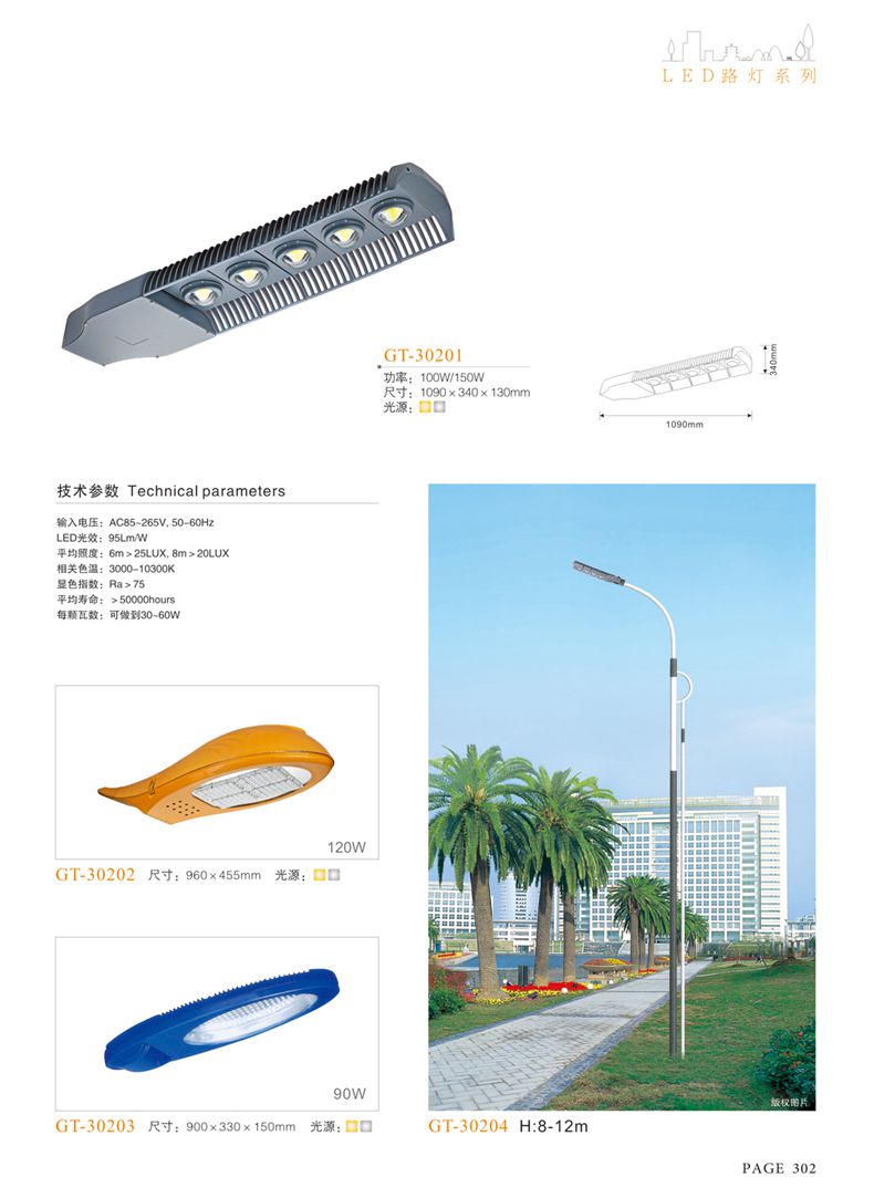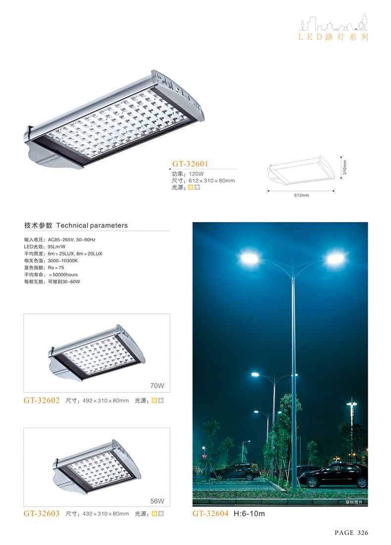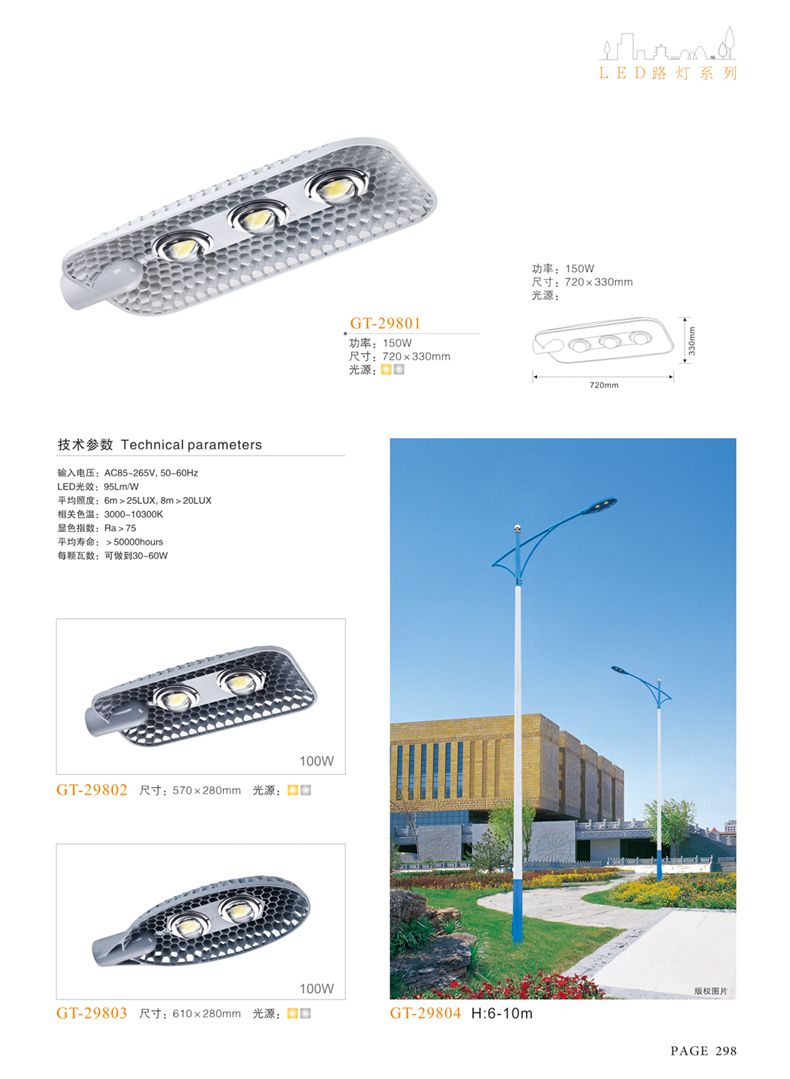 產(chǎn)品名稱:LED道路燈 配用光源:LED30-300W 高壓鈉燈150W、250W、400W 電源參數(shù):220V±10V/50Hz-60Hz 燈具燈頭:壓鑄鋁制品燈具,E40陶瓷燈頭 安裝高度:6米~12米 材料參數(shù):鐵制品內(nèi)外熱鍍鋅防腐處理,燈體表面噴優(yōu)質(zhì)戶外氟碳漆 產(chǎn)品特點:設(shè)計美觀、簡潔大方、安裝方便 使用場所:高速公路、城市道路、廠區(qū)、別墅等場所