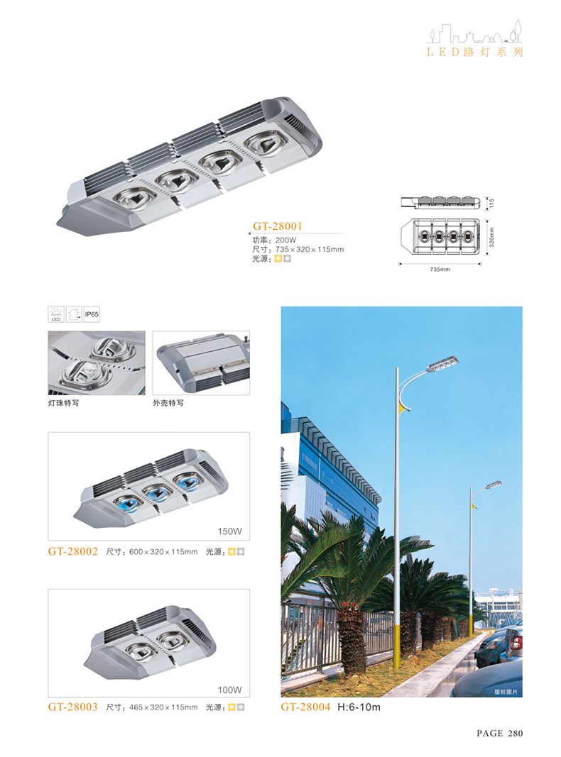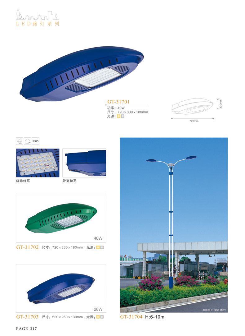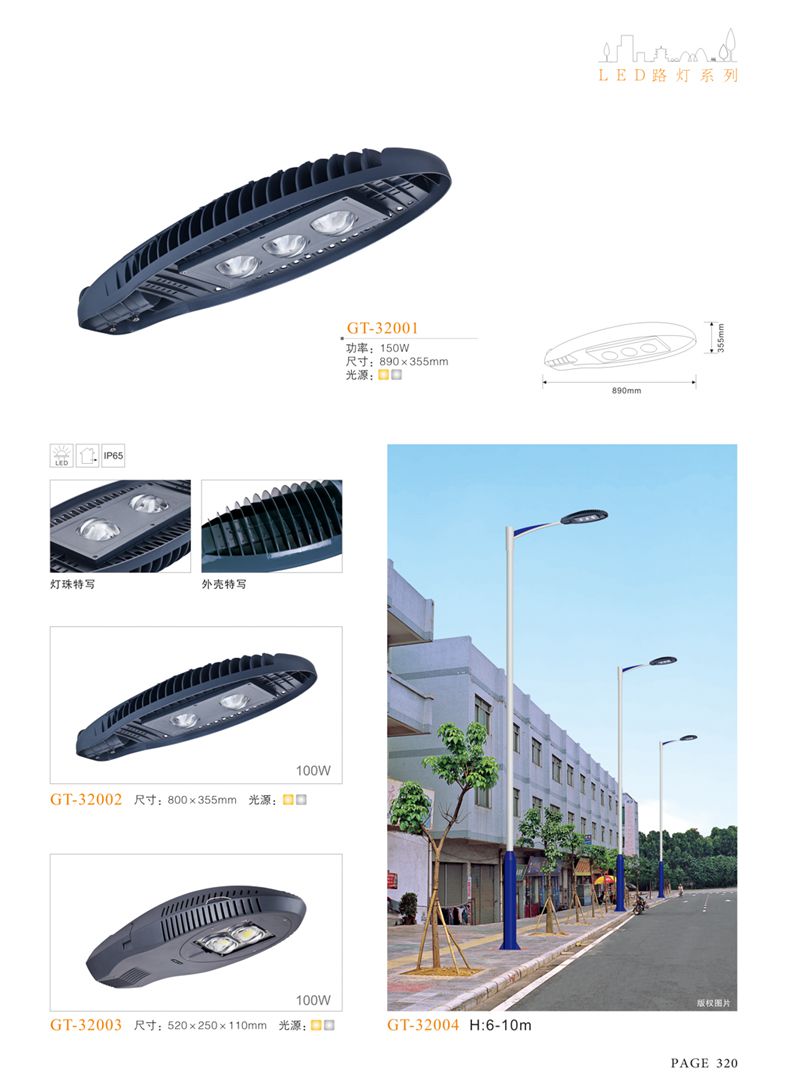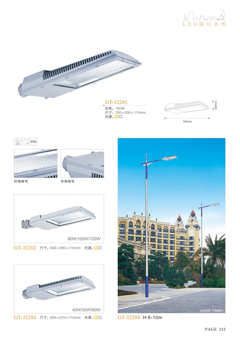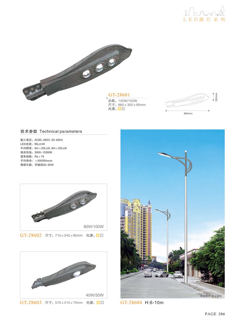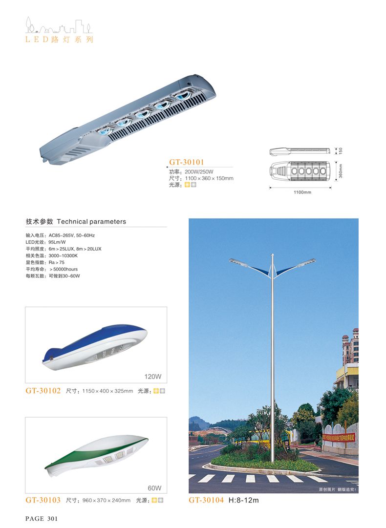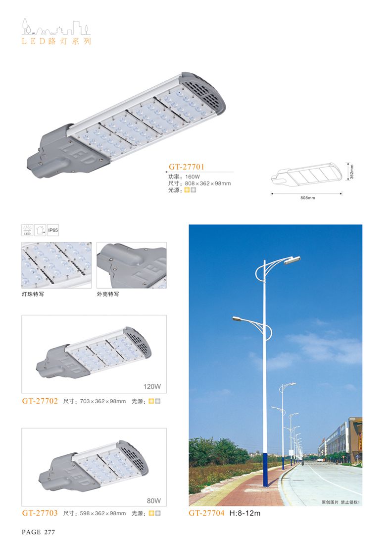 產(chǎn)品名稱:LED道路燈 配用光源:LED30-300W 高壓鈉燈150W、250W、400W 電源參數(shù):220V±10V/50Hz-60Hz 燈具燈頭:壓鑄鋁制品燈具,E40陶瓷燈頭 安裝高度:6米~12米 材料參數(shù):鐵制品內(nèi)外熱鍍鋅防腐處理,燈體表面噴優(yōu)質(zhì)戶外氟碳漆 產(chǎn)品特點:設(shè)計美觀、簡潔大方、安裝方便 使用場所:高速公路、城市道路、廠區(qū)、別墅等場所