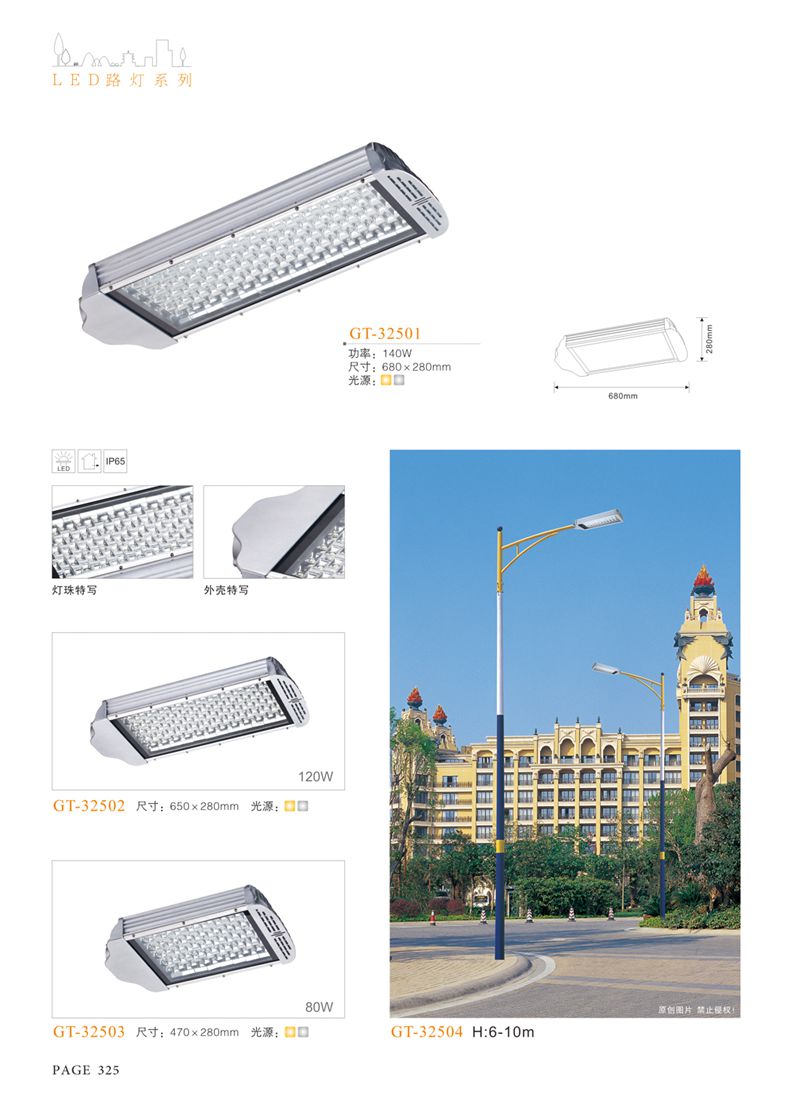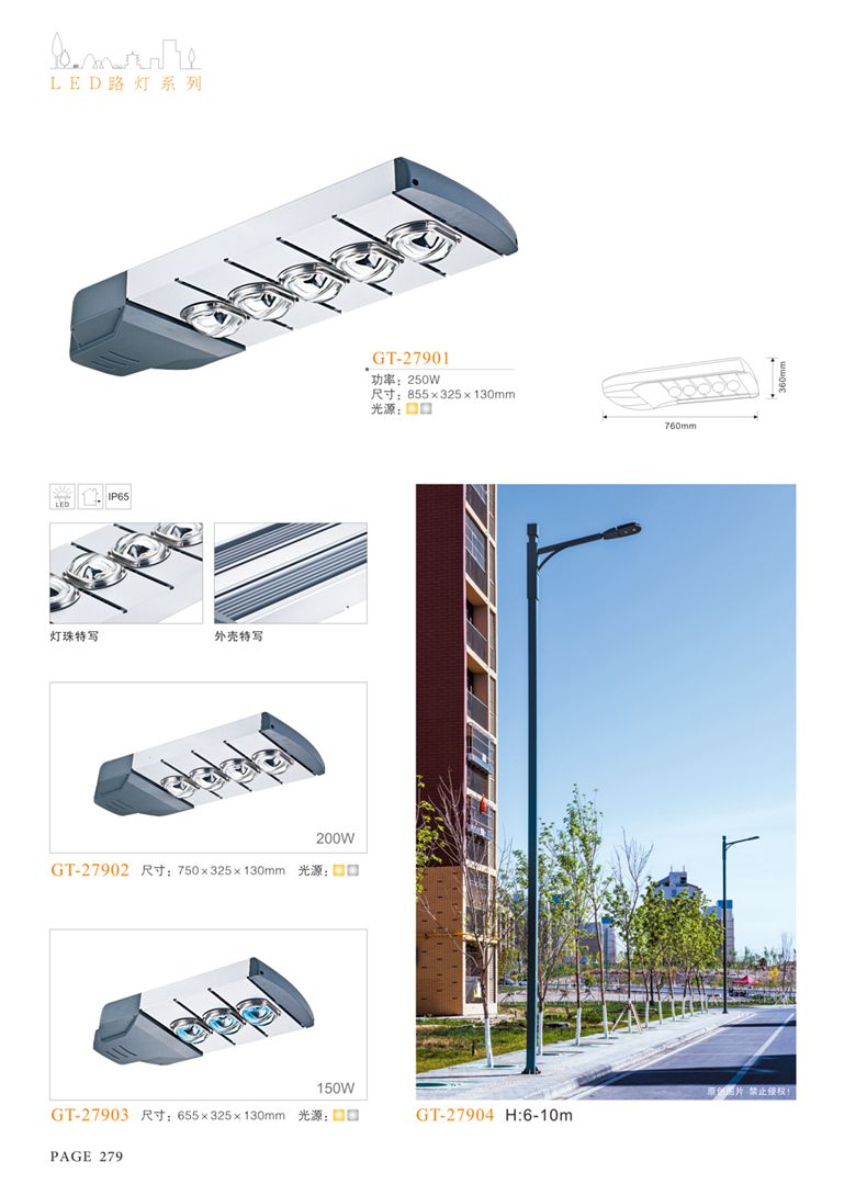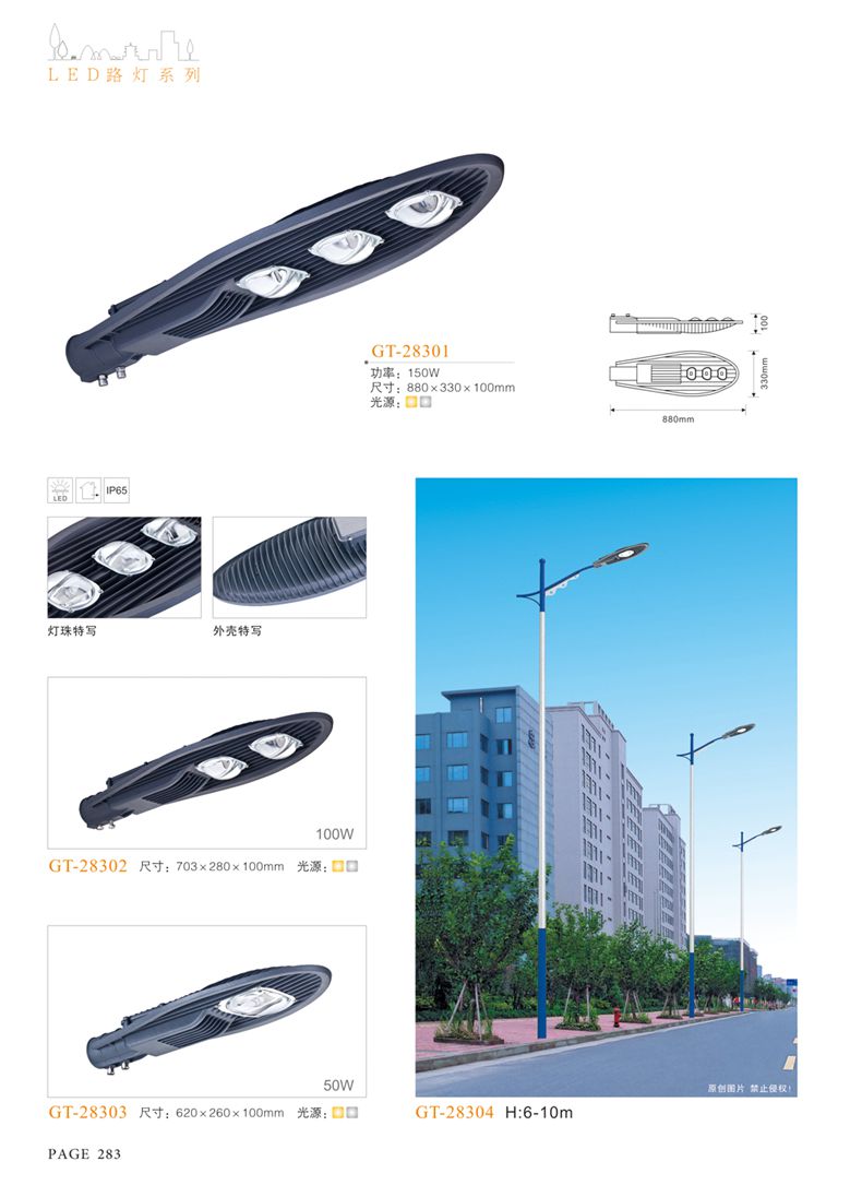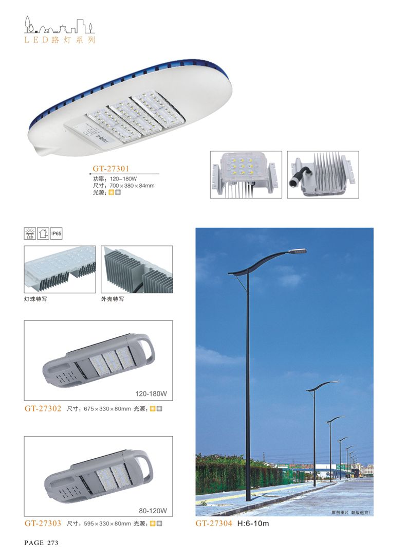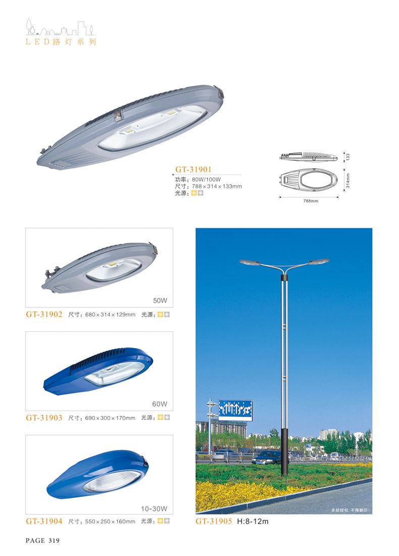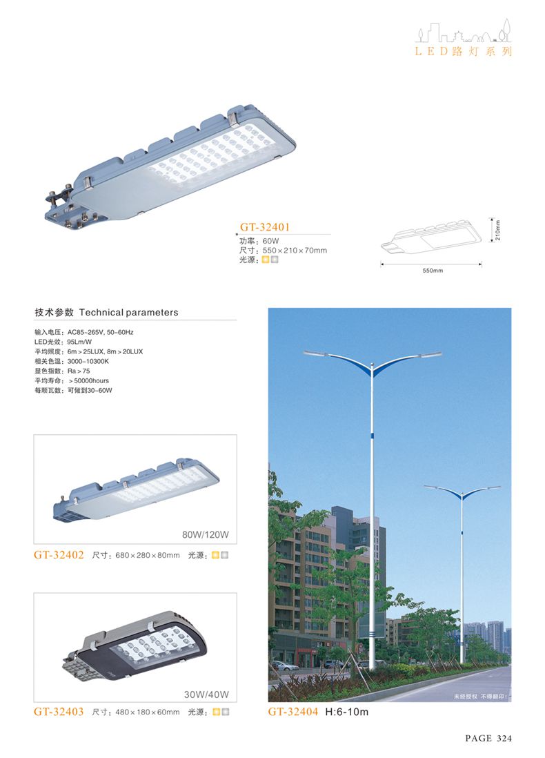 產(chǎn)品名稱:LED道路燈 配用光源:LED30-300W 高壓鈉燈150W、250W、400W 電源參數(shù):220V±10V/50Hz-60Hz 燈具燈頭:壓鑄鋁制品燈具,E40陶瓷燈頭 安裝高度:6米~12米 材料參數(shù):鐵制品內(nèi)外熱鍍鋅防腐處理,燈體表面噴優(yōu)質(zhì)戶外氟碳漆 產(chǎn)品特點:設(shè)計美觀、簡潔大方、安裝方便 使用場所:高速公路、城市道路、廠區(qū)、別墅等場所
