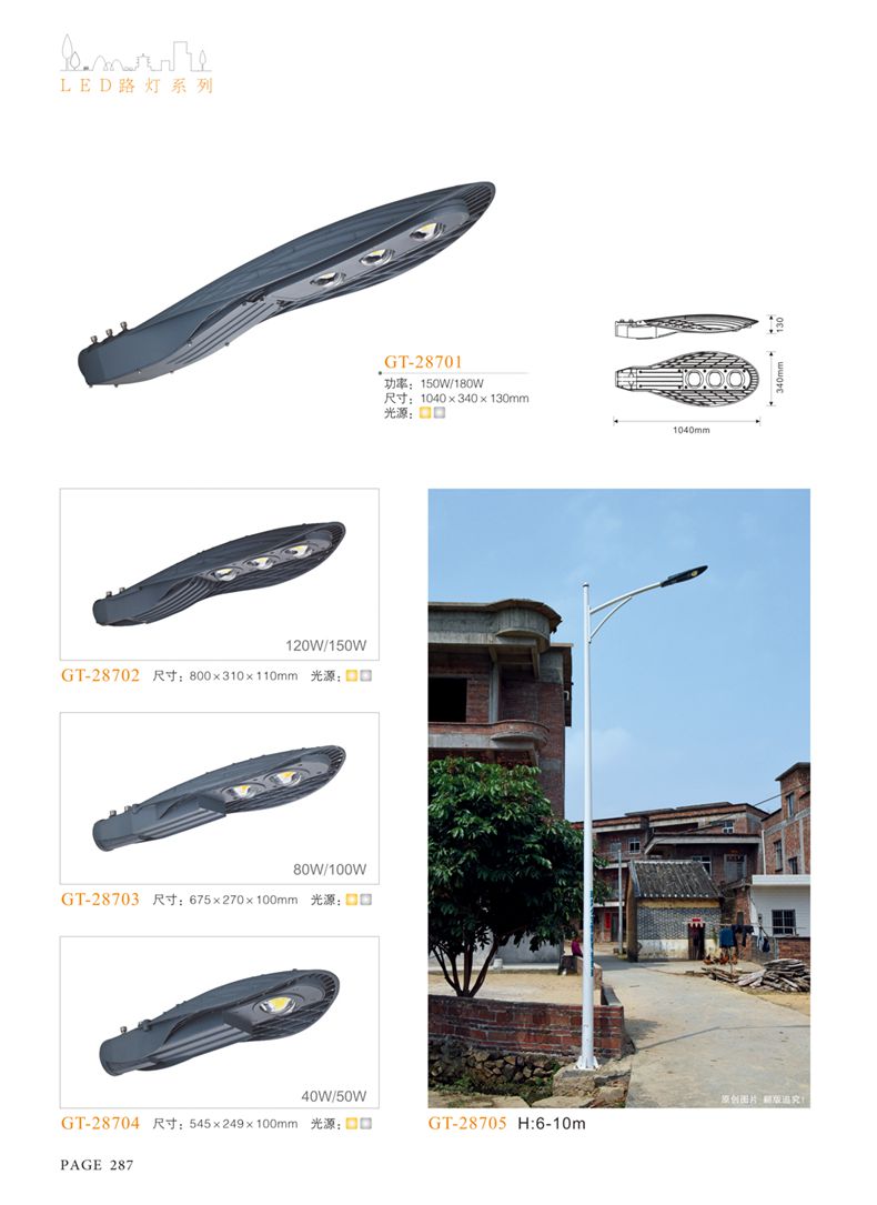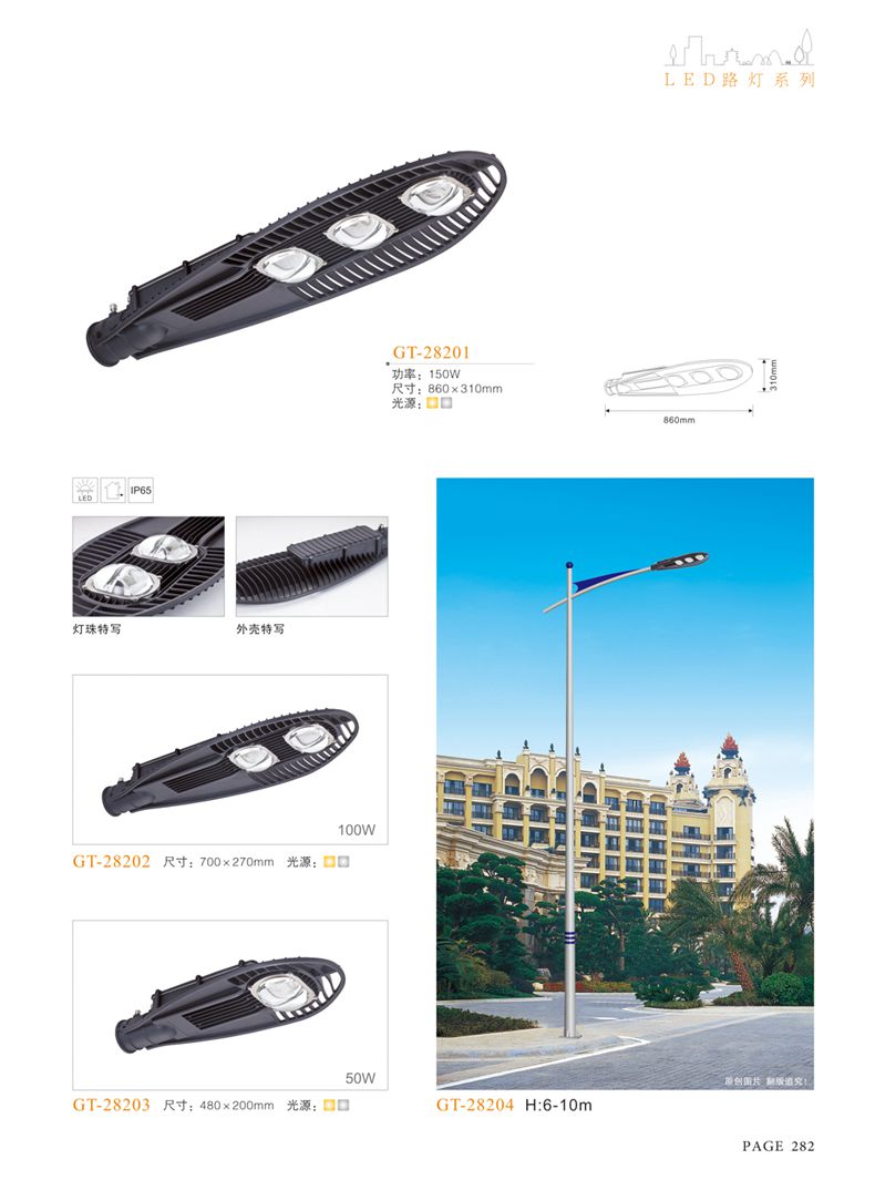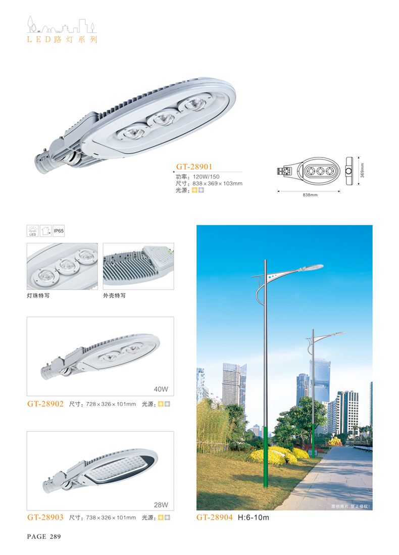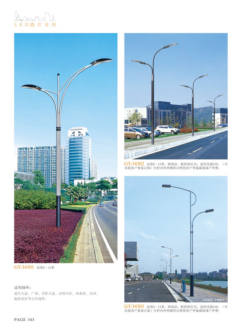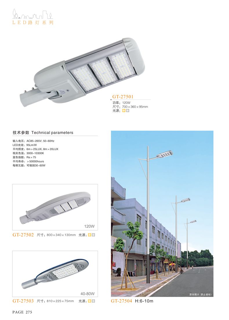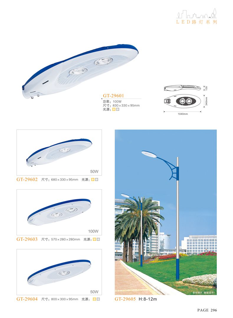 產(chǎn)品名稱:LED道路燈 配用光源:LED30-300W 高壓鈉燈150W、250W、400W 電源參數(shù):220V±10V/50Hz-60Hz 燈具燈頭:壓鑄鋁制品燈具,E40陶瓷燈頭 安裝高度:6米~12米 材料參數(shù):鐵制品內(nèi)外熱鍍鋅防腐處理,燈體表面噴優(yōu)質(zhì)戶外氟碳漆 產(chǎn)品特點:設(shè)計美觀、簡潔大方、安裝方便 使用場所:高速公路、城市道路、廠區(qū)、別墅等場所