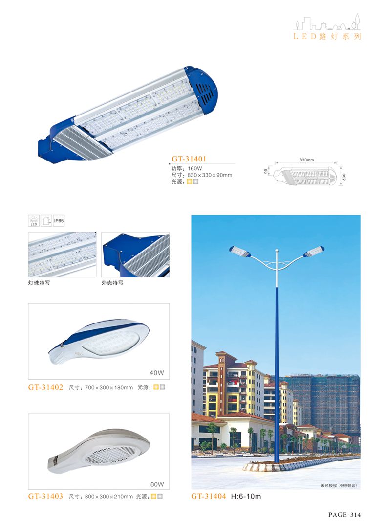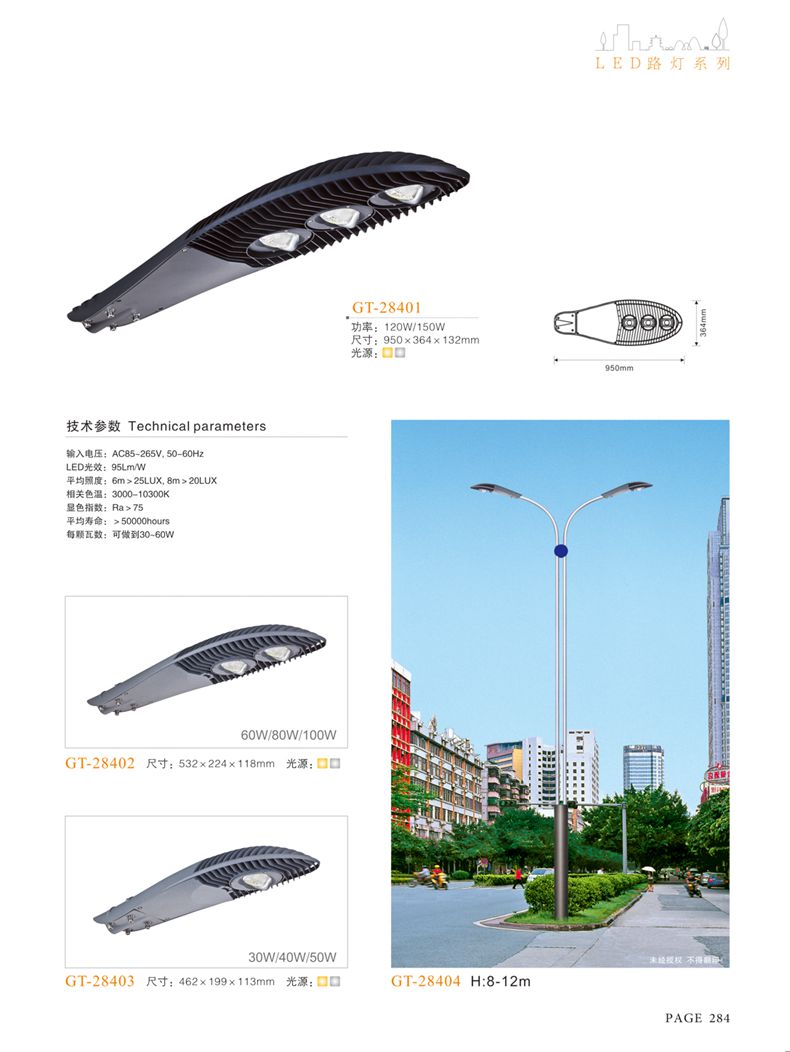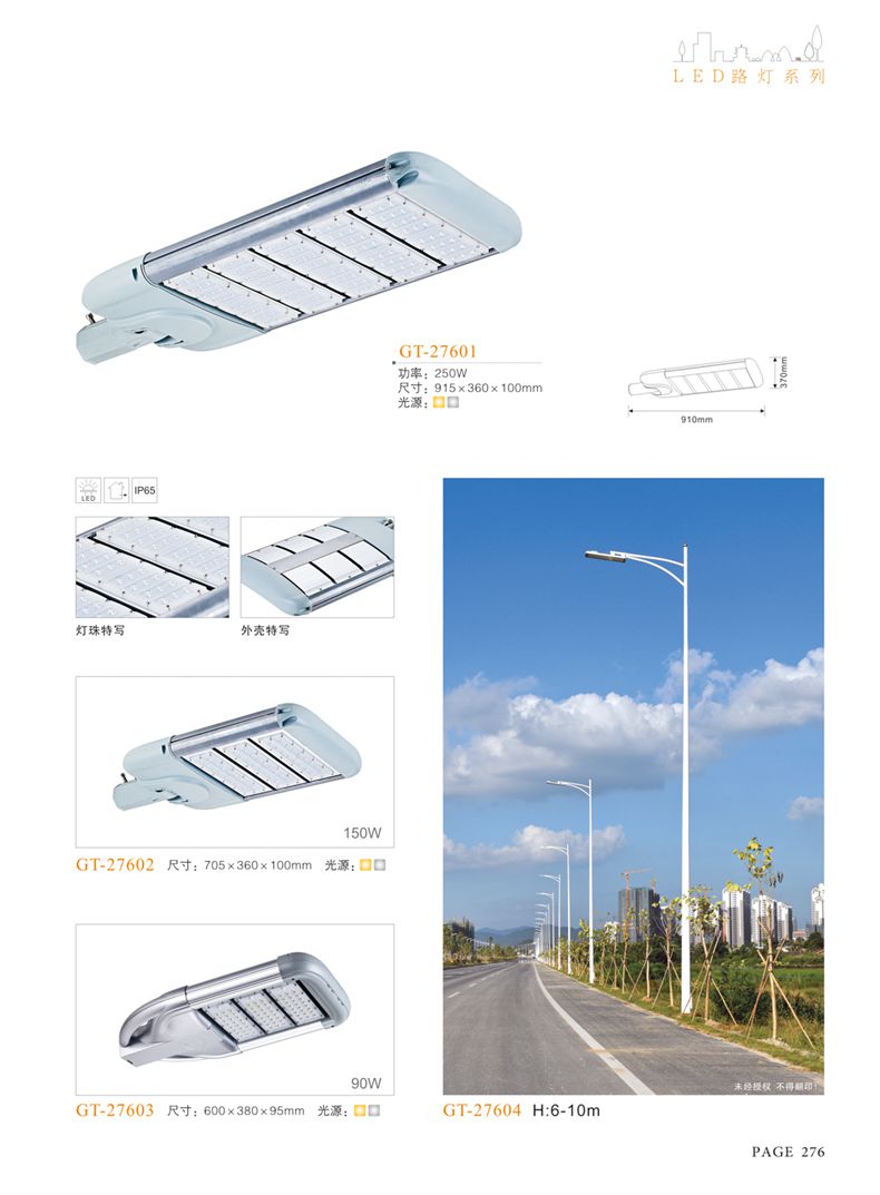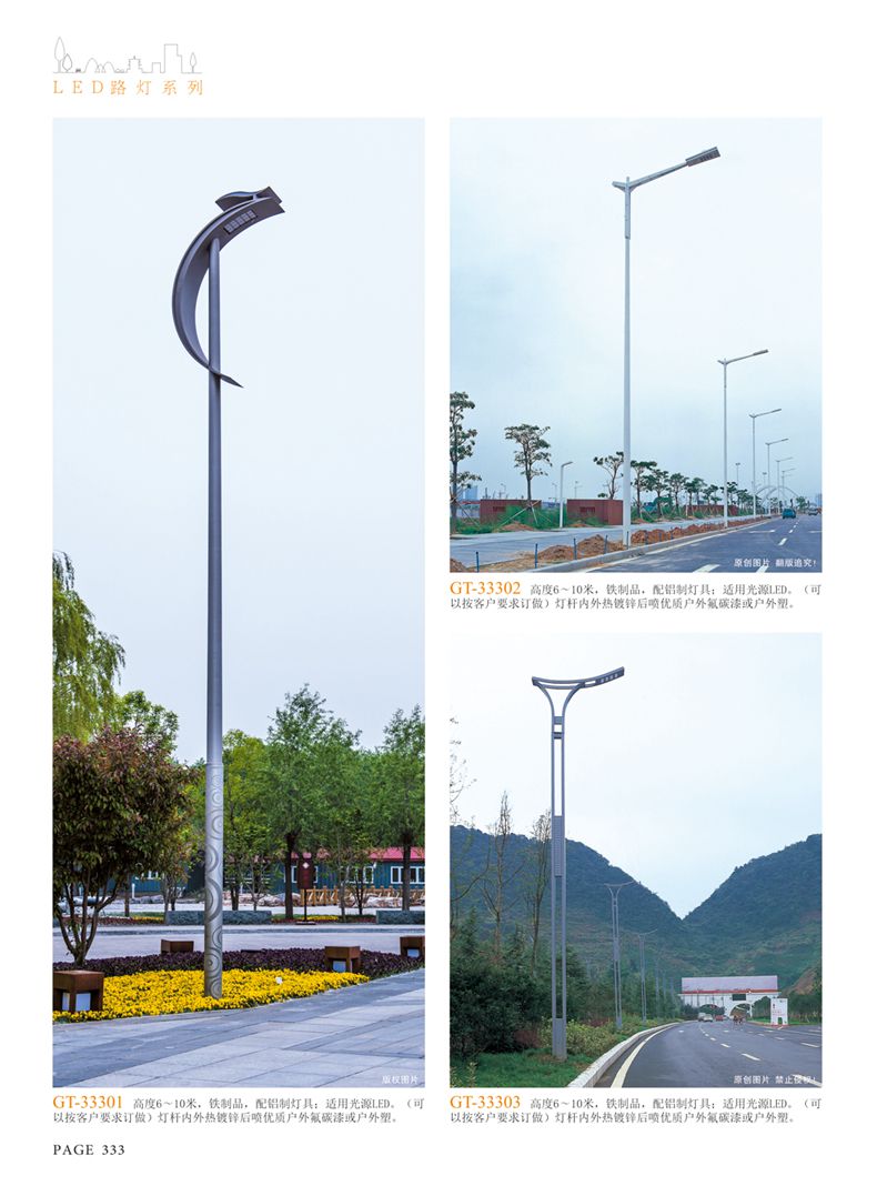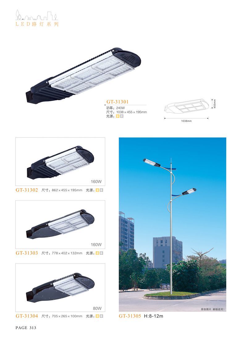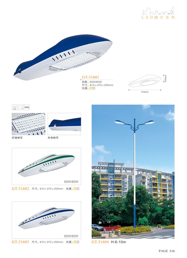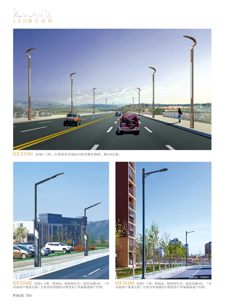 產(chǎn)品名稱:LED道路燈 配用光源:LED30-300W 高壓鈉燈150W、250W、400W 電源參數(shù):220V±10V/50Hz-60Hz 燈具燈頭:壓鑄鋁制品燈具,E40陶瓷燈頭 安裝高度:6米~12米 材料參數(shù):鐵制品內(nèi)外熱鍍鋅防腐處理,燈體表面噴優(yōu)質(zhì)戶外氟碳漆 產(chǎn)品特點:設(shè)計美觀、簡潔大方、安裝方便 使用場所:高速公路、城市道路、廠區(qū)、別墅等場所