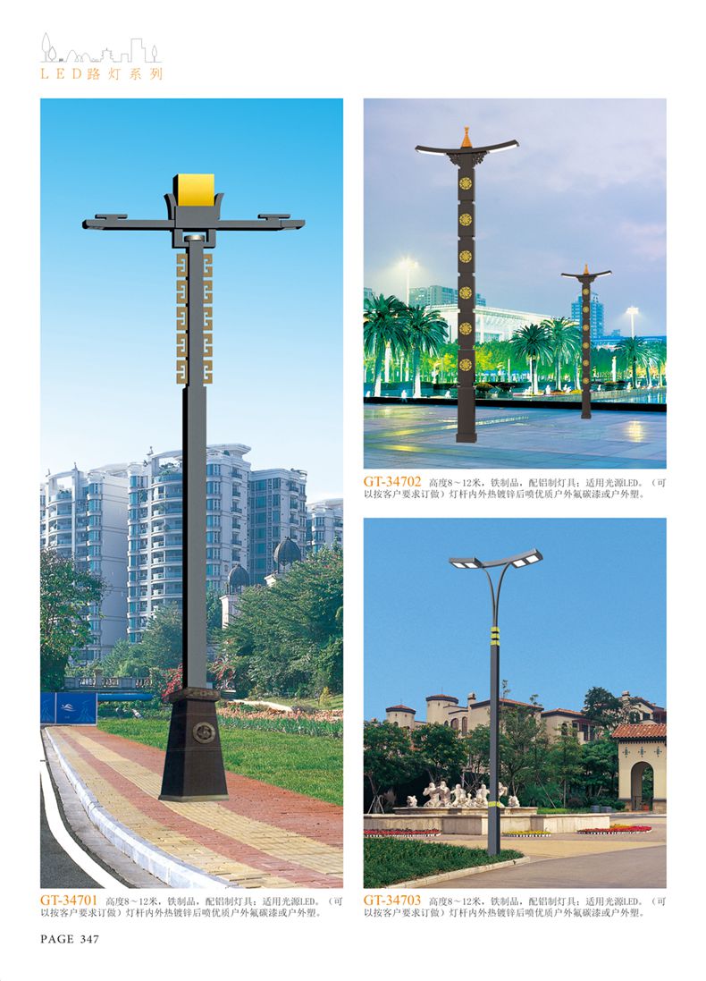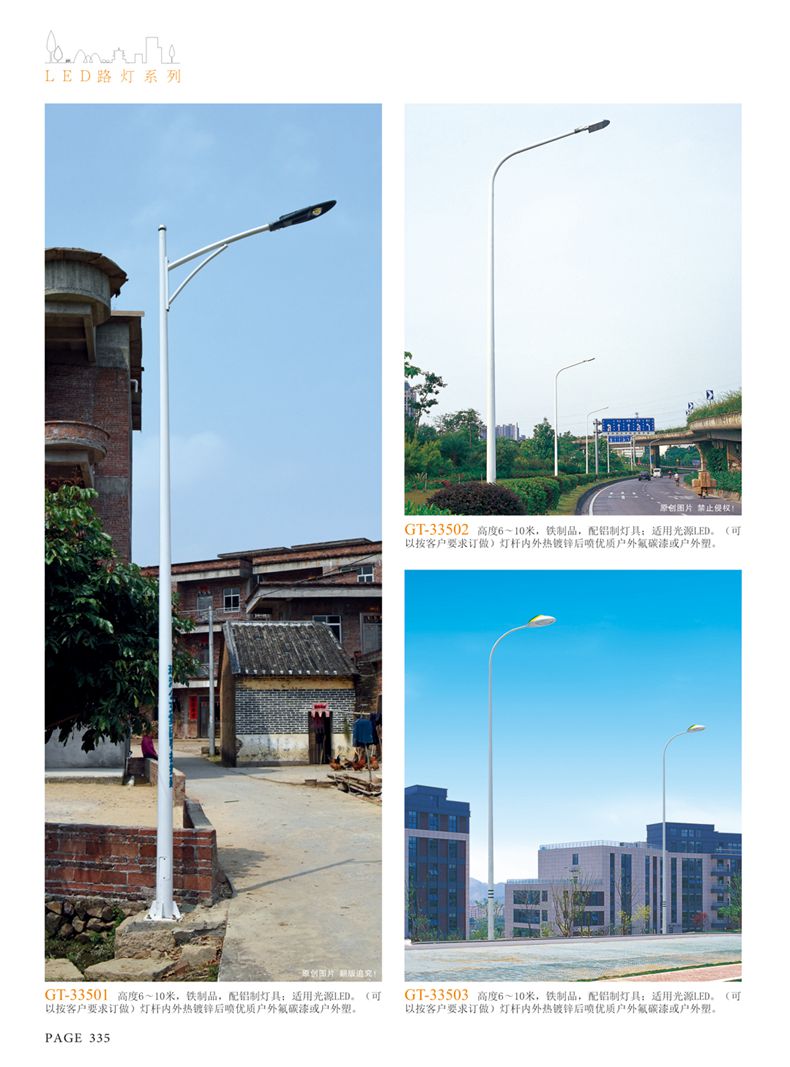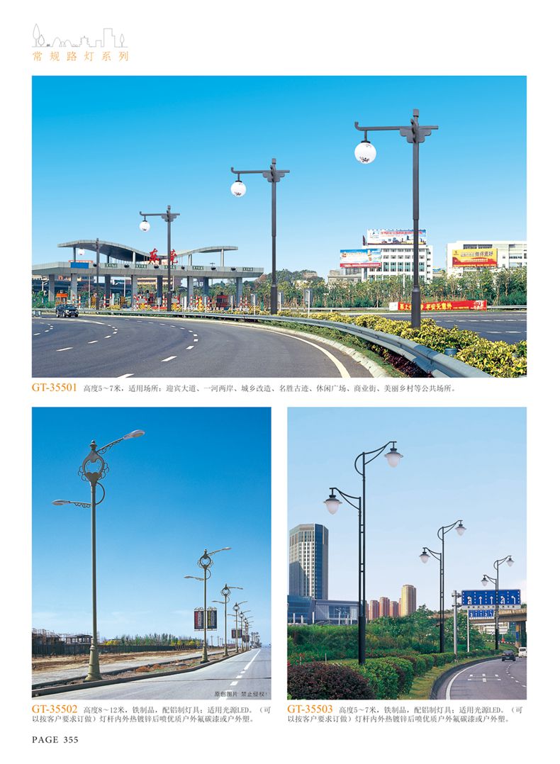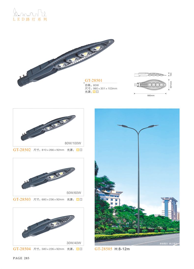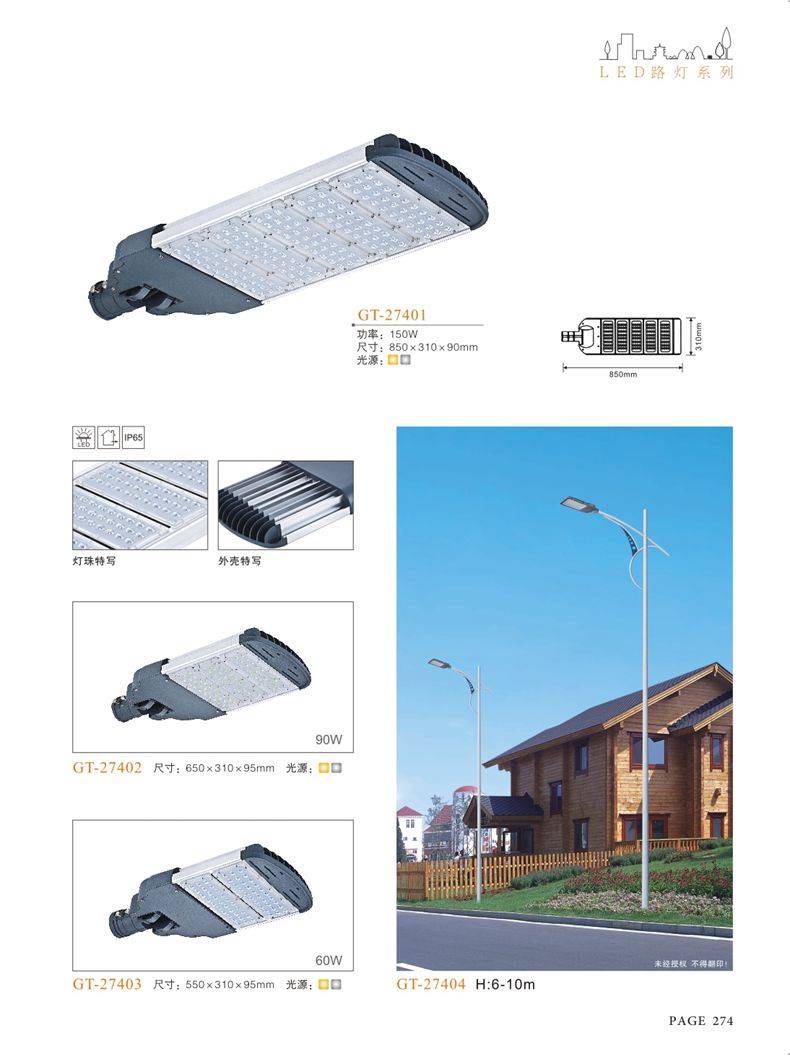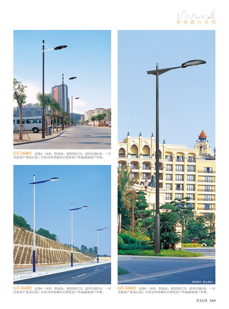 產(chǎn)品名稱:LED道路燈 配用光源:LED30-300W 高壓鈉燈150W、250W、400W 電源參數(shù):220V±10V/50Hz-60Hz 燈具燈頭:壓鑄鋁制品燈具,E40陶瓷燈頭 安裝高度:6米~12米 材料參數(shù):鐵制品內(nèi)外熱鍍鋅防腐處理,燈體表面噴優(yōu)質(zhì)戶外氟碳漆 產(chǎn)品特點:設(shè)計美觀、簡潔大方、安裝方便 使用場所:高速公路、城市道路、廠區(qū)、別墅等場所